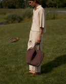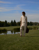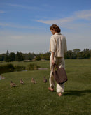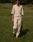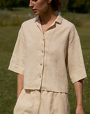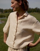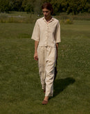 Pair it with tailored trousers or skirts for the office, or wear it with linen pants or jeans for a laid-back casual look. In the photos, the model is wearing EDELWEISS in Bleached Sand linen, styled with our COCOS v2.0 pants.