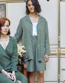 Kateryna is 5′5″ (165 cm) and modelling size S in Green Bay medium weight linen 150 GSM. Her measurements are as follows: bust 34.50" (88 cm), waist 26.80" (68 cm), hips 37" (94 cm). Marina is 5′10″ (178 cm) and modelling size S.