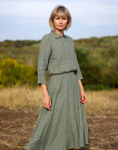 Inspired by the natural world’s circular patterns—like those found in flowers, butterfly wings, and shells—the PARADISEA linen dress celebrates life’s constant motion. Its full, circular midi-length skirt invites you to twirl with joy, while the 3/4-length sleeves and blouson shirt bodice with charming coconut button detailing offer a relaxed yet polished look. The elasticated waist ensures comfort and a flattering fit, and two spacious skirt pockets add practicality.