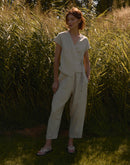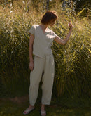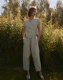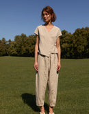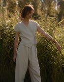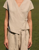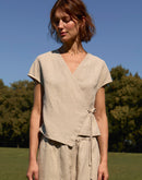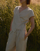 CALLA is a linen wrap crop top developed from our LILY vest — keeping the same graceful shape, now reimagined with short sleeves and a slightly cropped silhouette.