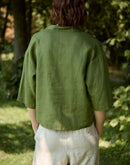 - Design: open polo-style collar, elbow-length sleeves, straight relaxed fit, cropped length