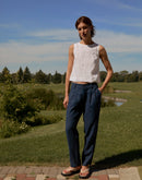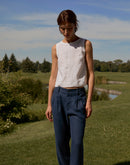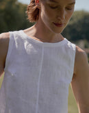 Cut from pure softened linen, it has a clean, straight silhouette with wide straps that easily cover bra lines and small side slits that let the fabric move freely.