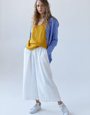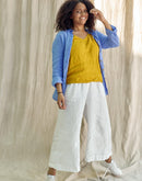 Adele is 5’8" (173 cm) and modelling size S in Golden Yellow light-weight linen 135 GSM.