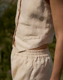 Designed with clean lines and mock pockets, ORCHID keeps a refined look while staying comfortable. The front is fully lined with linen to hold its shape and avoid transparency, while the back is made from a single layer – light, breathable, and comfortable for warmer days. A tie at the back allows you to adjust the fit to your preference.