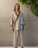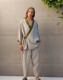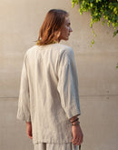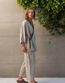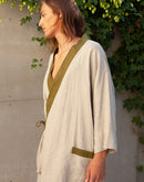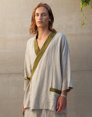 In Japanese culture, there is a philosophy called Wabi-Sabi, which celebrates the beauty found within the imperfection of life. Linen itself is a perfect example of Wabi-Sabi; for its beauty lies within its wrinkles. Our Tigerlily kimono shirt is inspired by this aesthetic. The dramatic draping cut and tapered sleeves of the traditional kimono are translated, through the contrasting natural charm of the cloth, into a contemporary garment of quiet everyday elegance that perfectly flatters the masculine form. It features side ties, a deep v-neckline and one generous pocket; all beautifully edged in a contrasting color of your choice. Looks stunning paired with our Cocos pants.