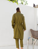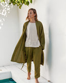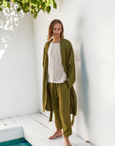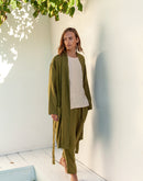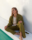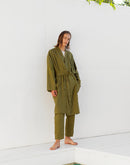 Model is 6’4” (192 cm) and modelling size L in Avocado medium weight linen 170 GSM. Available in any other color from our palette.