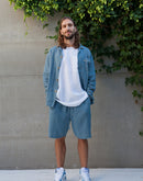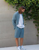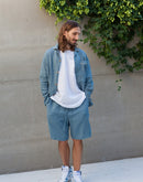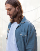 Model is 6’1” (186 cm) and modelling size L in Smoke Blue medium weight linen 170 GSM. Available in any other color from our palette.