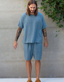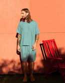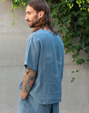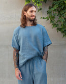 Photos 1-2: Model is 6’1” (186 cm) and modelling size L in Cameo Blue medium weight linen 170 GSM.