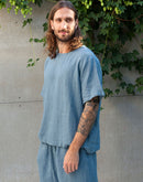 Photos 3-6: Model is wearing size L in Smoke Blue medium weight linen 170 GSM. Available in any other color from our palette.