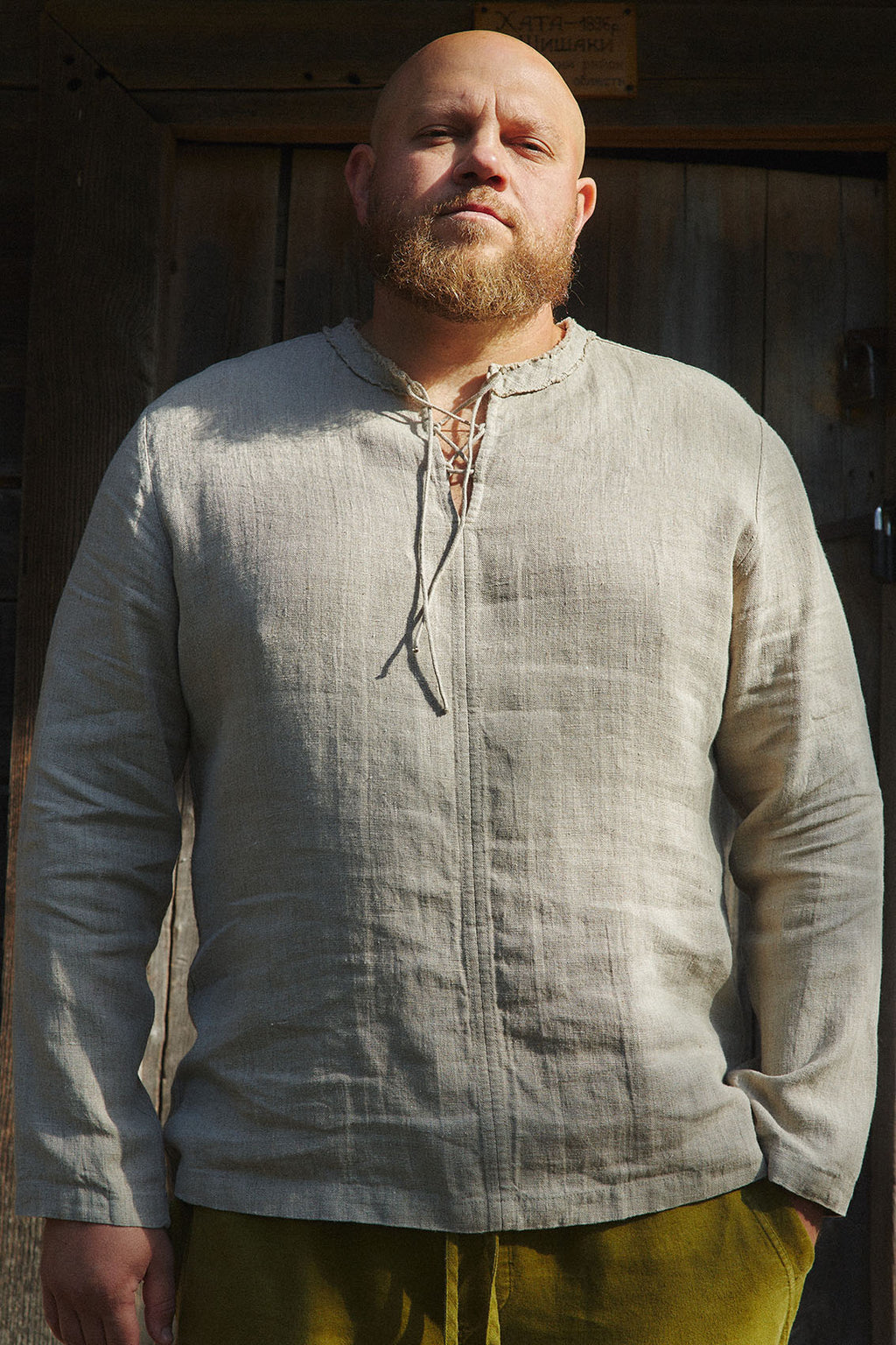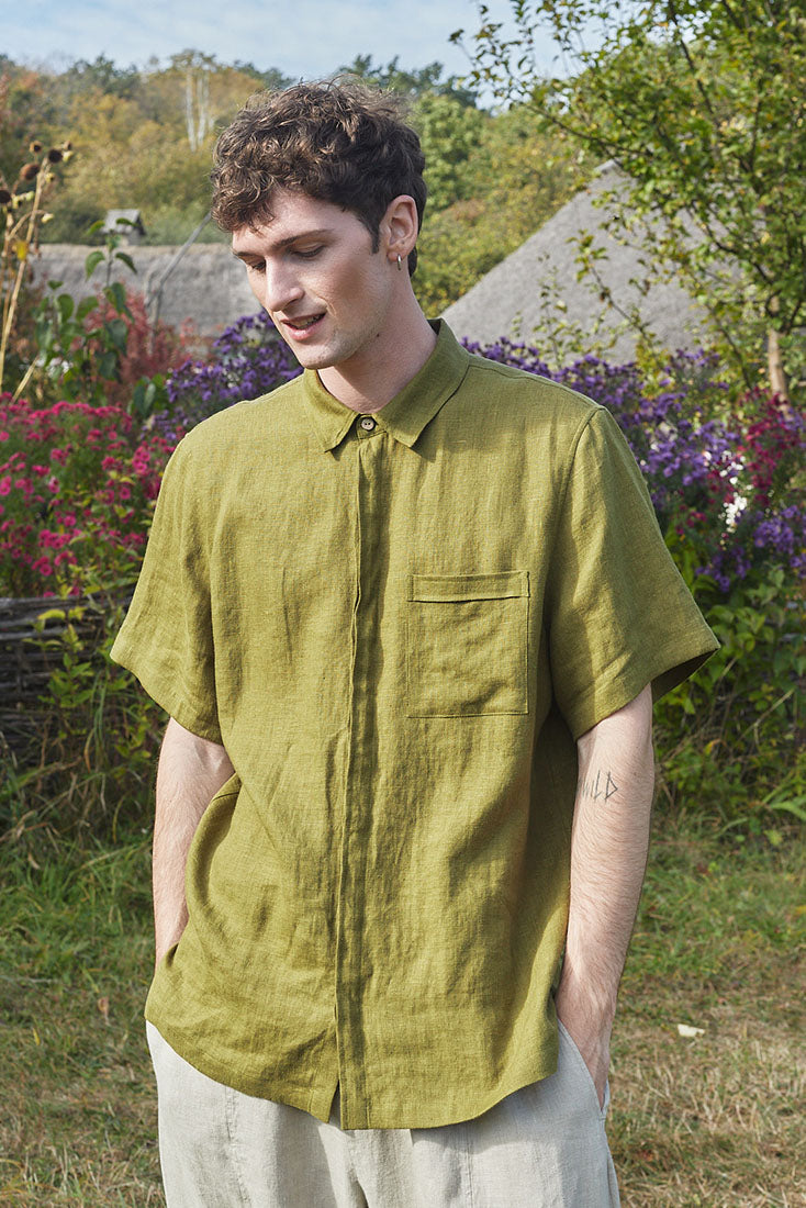 Model is 6’4” (192 cm) and modelling size L in Black Iris light weight linen 135 GSM. Available in any other color from our palette.