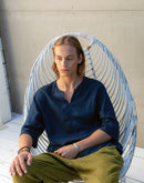 Model is 6’4” (192 cm) and modelling size L in black iris lightweight linen 145 GSM. Available in any other color from our palette.
