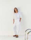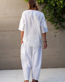Model (photos 5-7) is 6’4” (192 cm) and modelling size S in White lightweight linen 145 GSM.