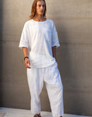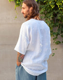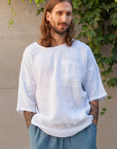 Model (photos 1-4) is 6’1” (186 cm) and modelling size L in White lightweight linen 145 GSM. Available in any other color from our palette.