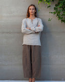 Please note that to honour the philosophy of slow fashion and the relaxed nature of linen, all of our garments have been designed to have a loose and comfortable fit. Please refer to our size chart to compare the actual garment size against your body size. If you prefer a more fitted look, we recommend that you choose a size down from your normal measurements.