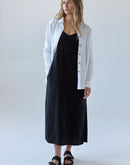 This button-through, slightly oversized linen shirt with pretty pleating on the back also features drop shoulders, barrel sleeves and a classic tab collar. Incredibly versatile, her streamlined look without pockets means she can also be worn as a light jacket over our other tops and dresses.