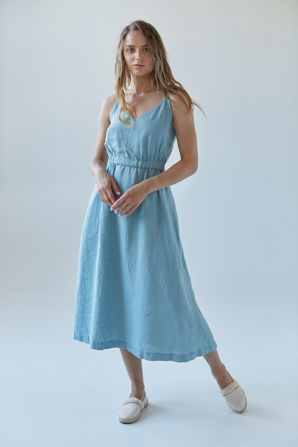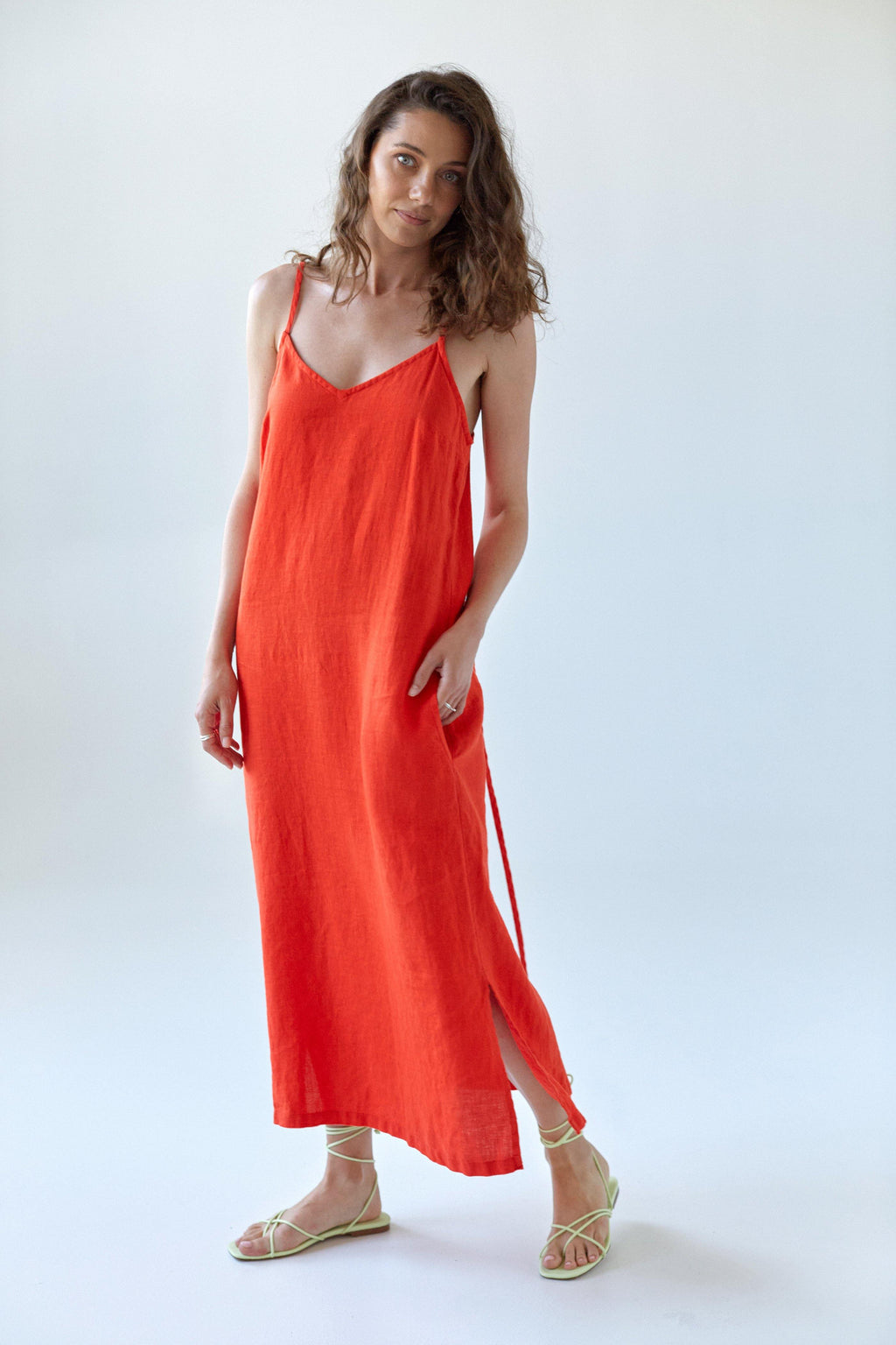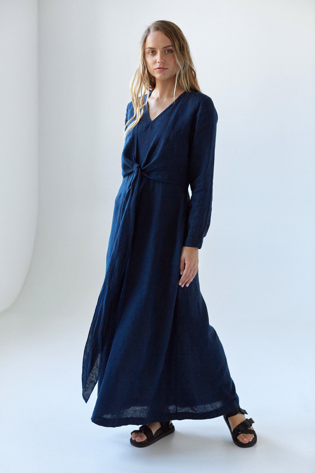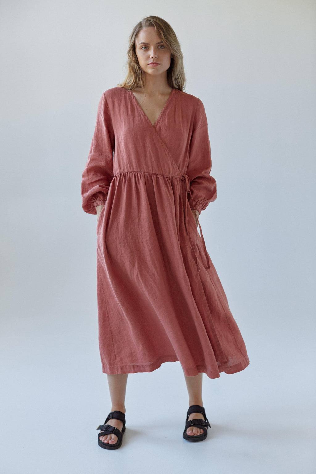 Marina is 5′10″ (178 cm) and modelling size S in Golden Glow medium weight linen. Her measurements are as follows: bust 35.50" (90 cm), waist 25.50" (63 cm), hips 36.50" (93 cm).