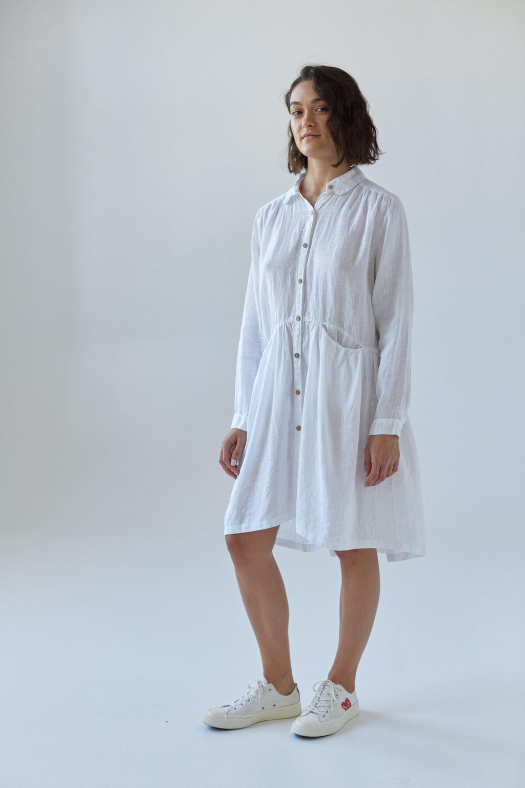 Sweet, short and swingy, our DELILIA dress is a ray of pure sunshine. You can almost hear the calypso music, steel drums and the calls of brightly colored tropical birds as she sashays to your every step. Buttoned down the front, with a circular collar and three quarter sleeves with soft cuffs; the crowning glory of this loose and lovely piece is her asymmetric, full-circle skirt. Also wearable as a long shirt over our BABIANA and BERBERIS linen pants.