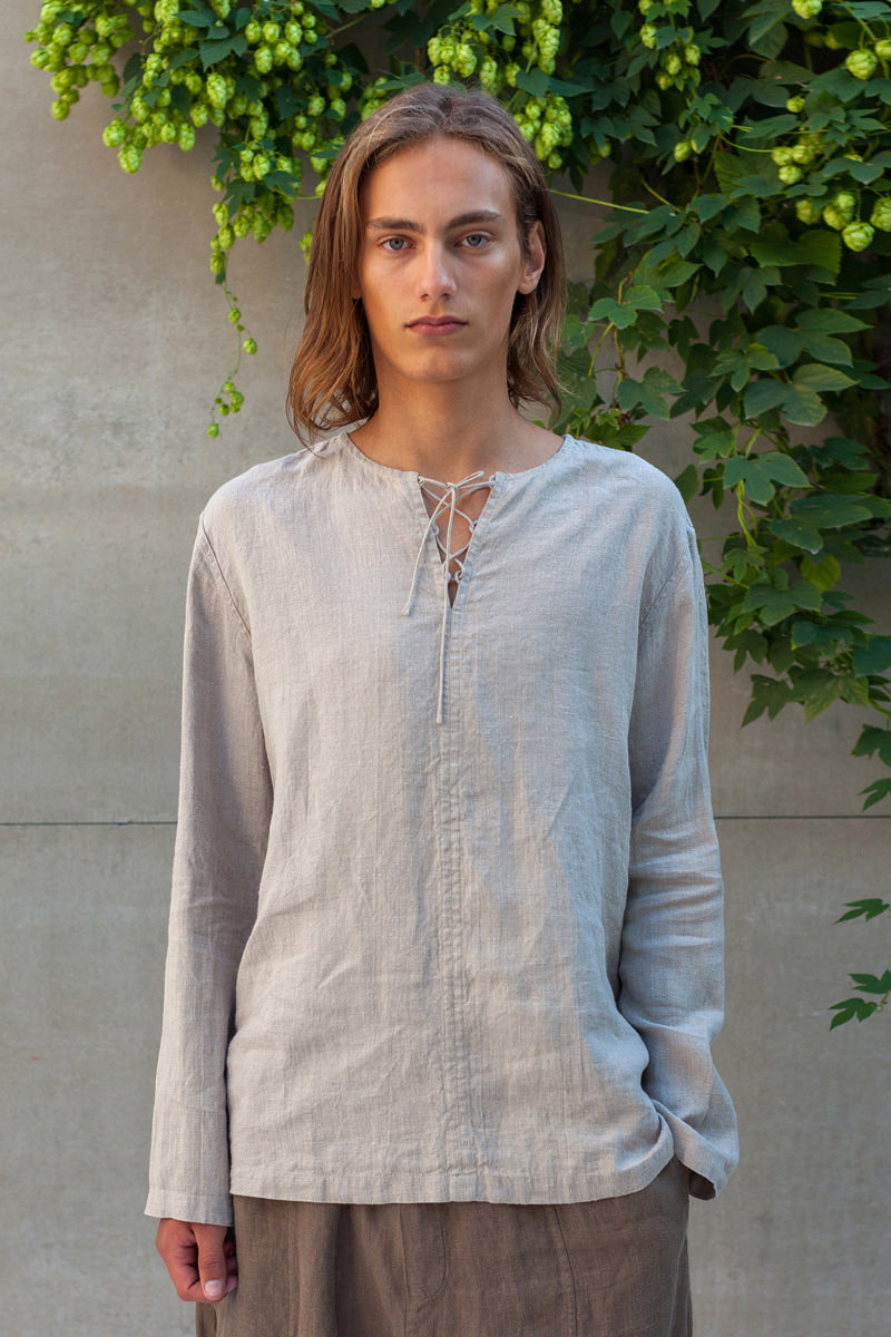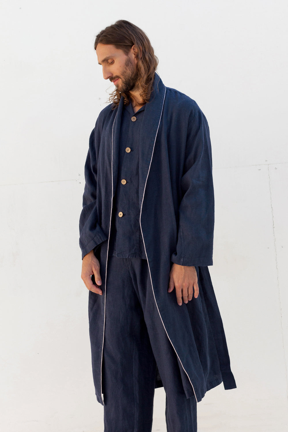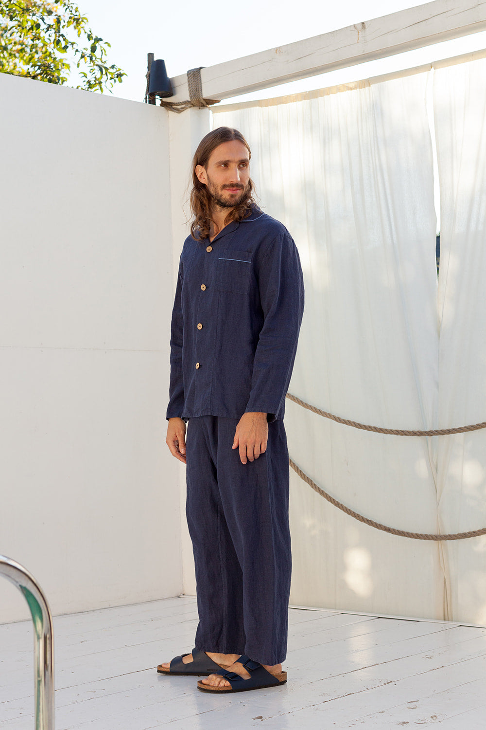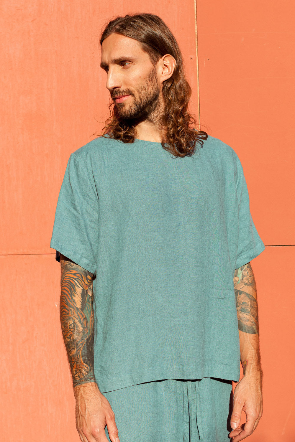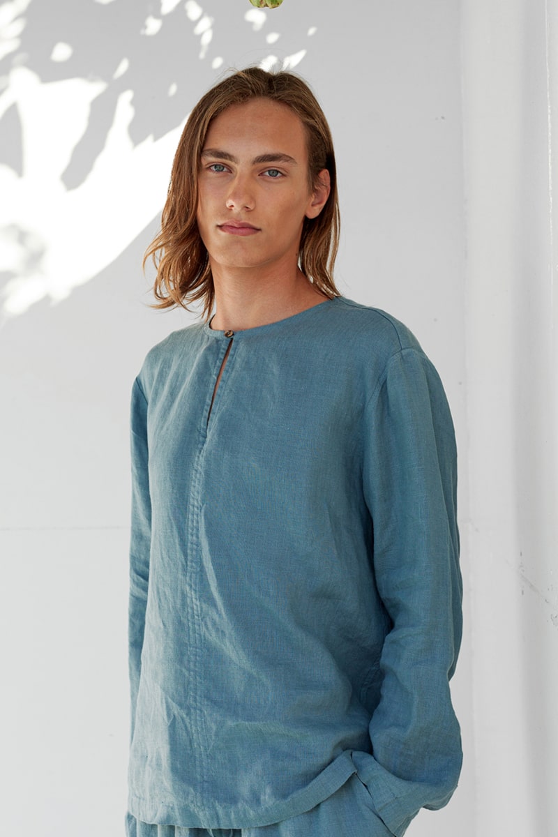 Model is 6’4” (192 cm) and modelling size L in Smoke Blue medium weight linen 170 GSM.