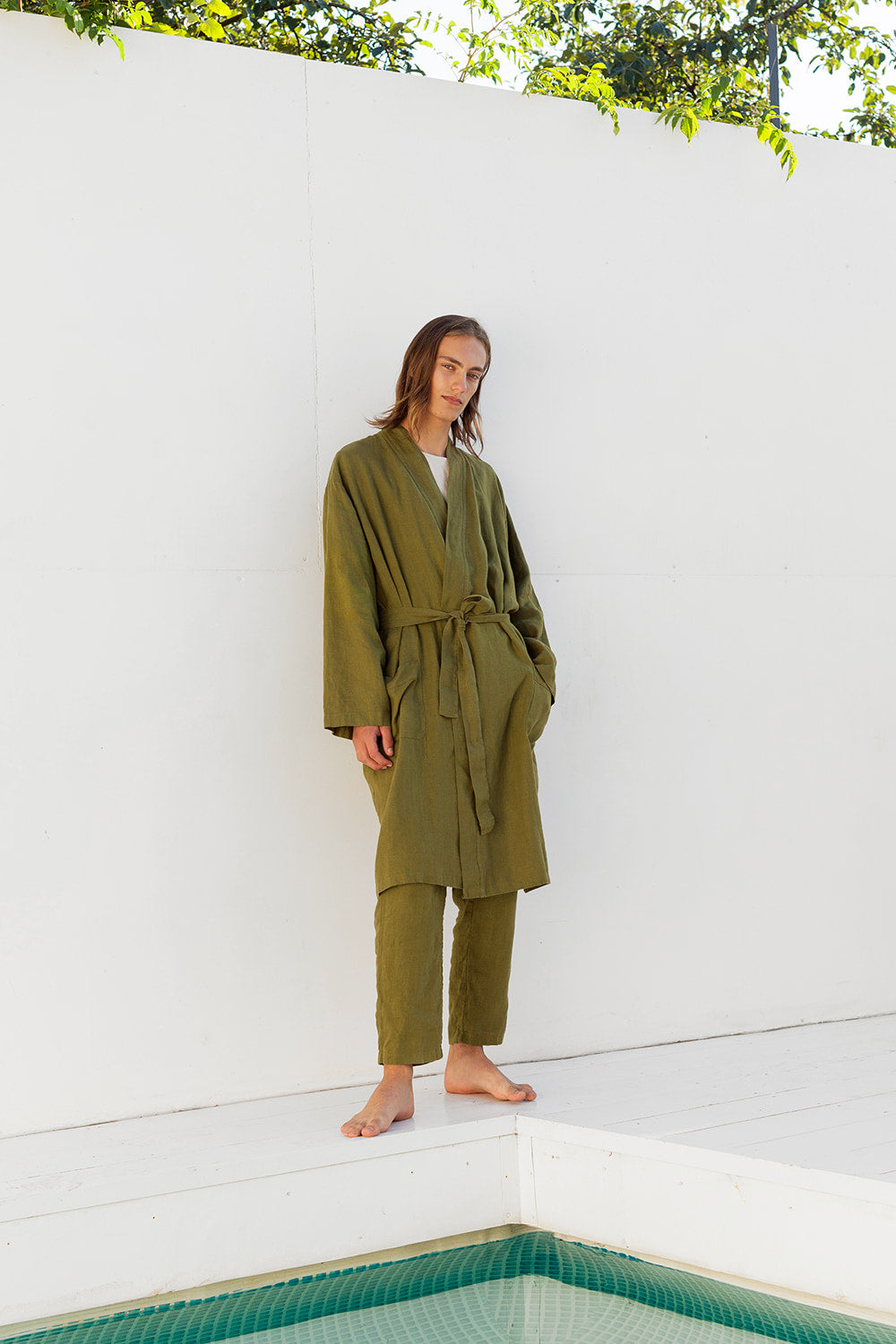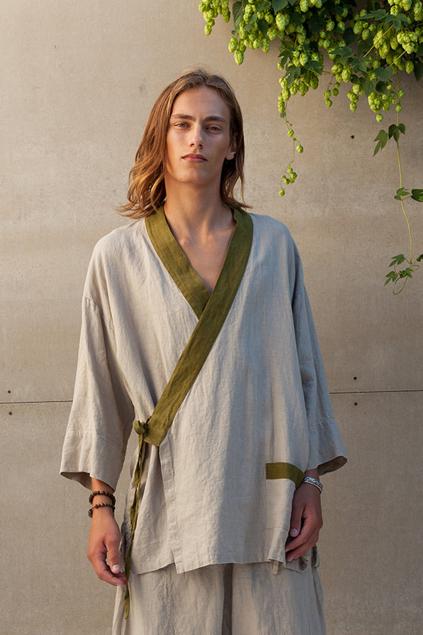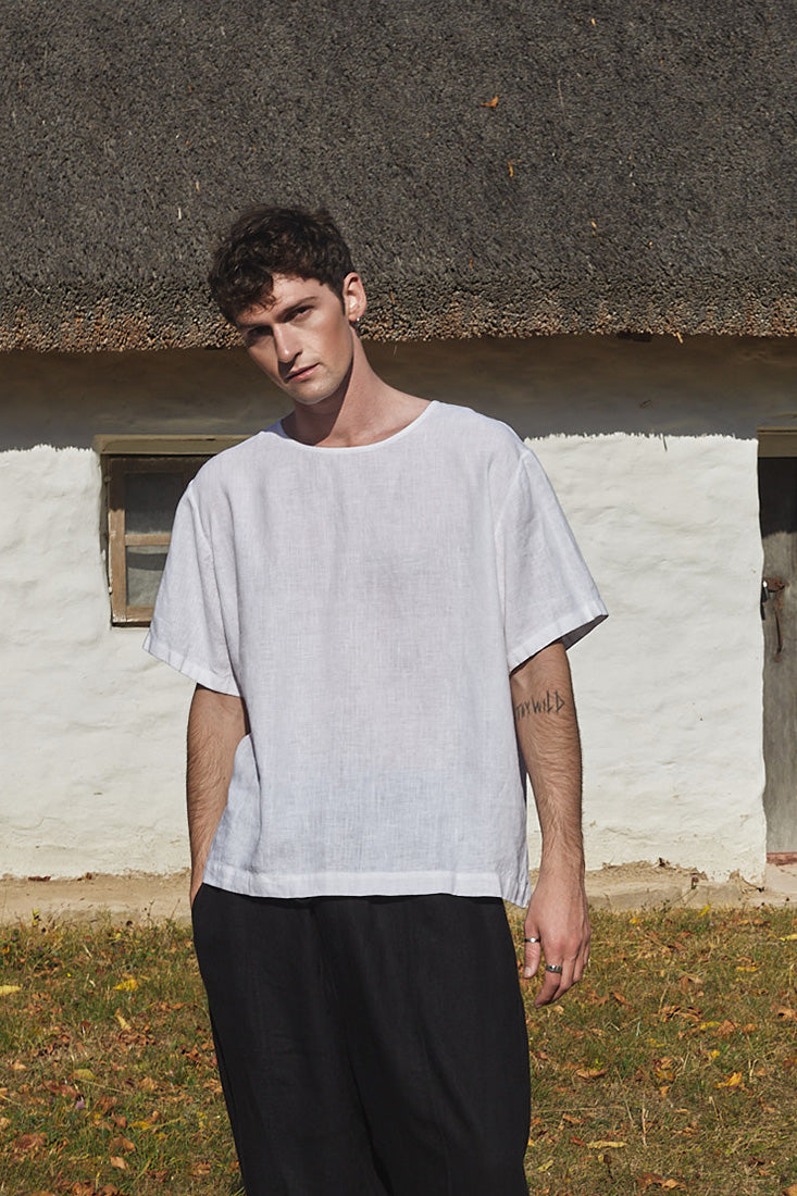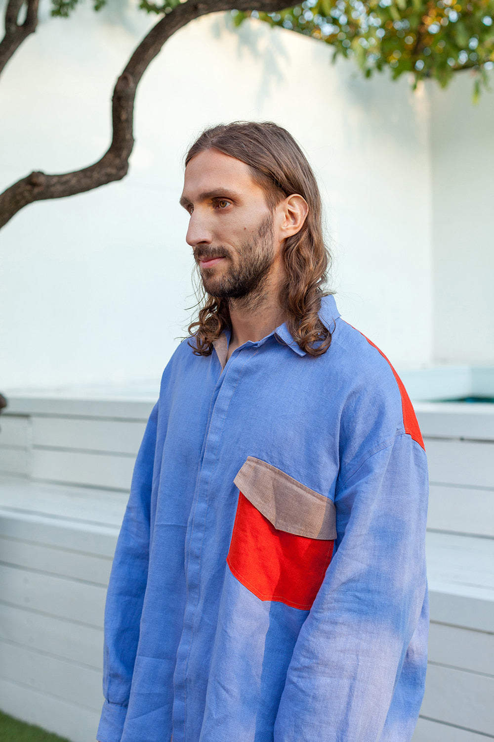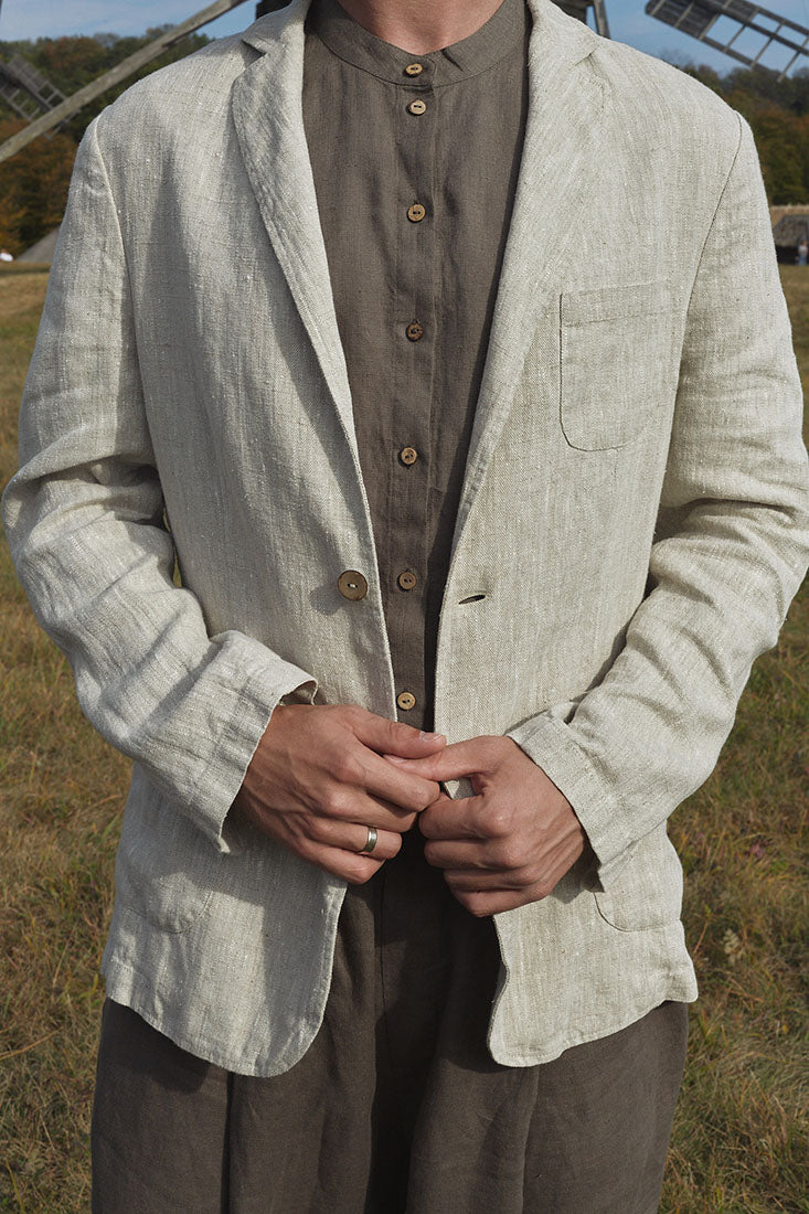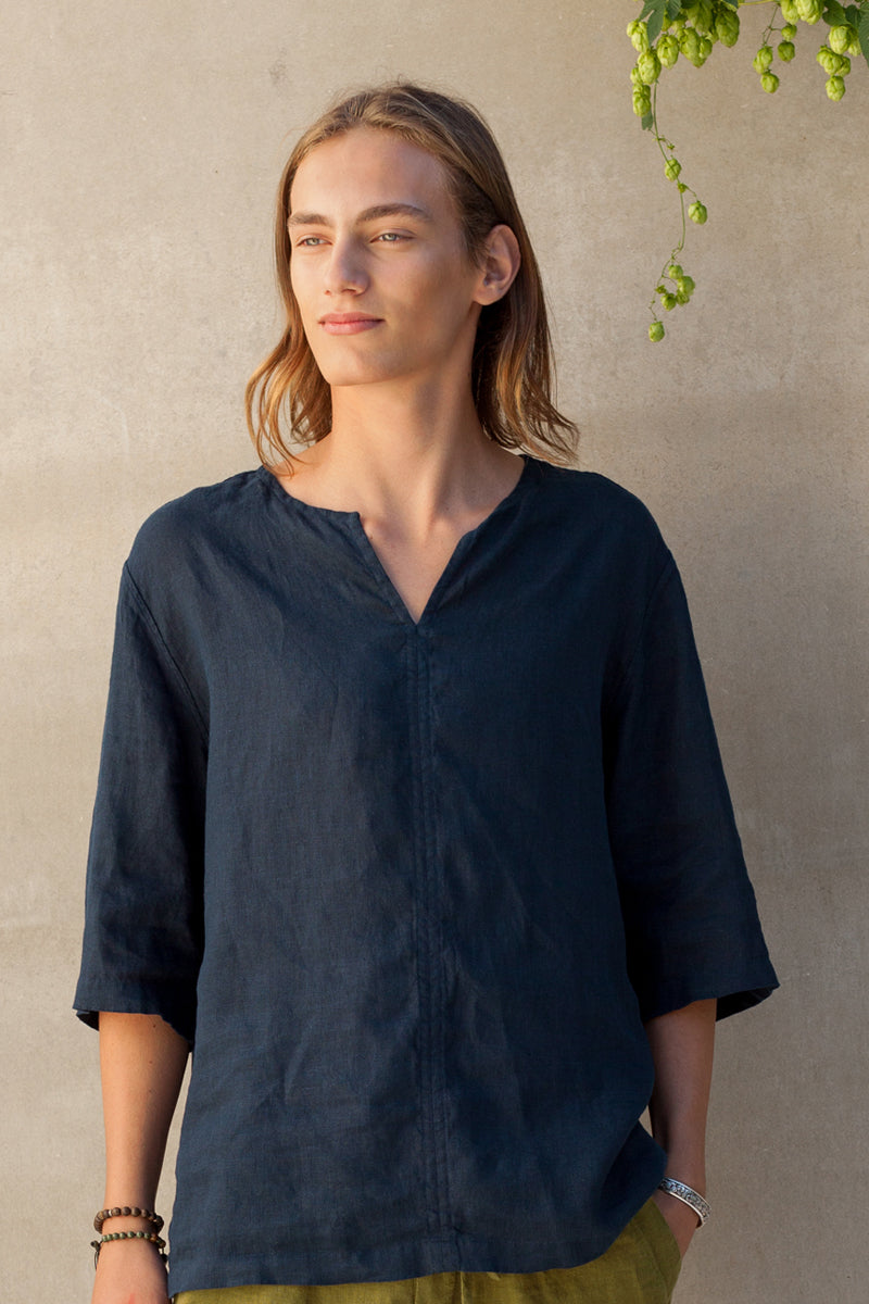 Model is 6’4” (192 cm) and modelling size L in Smoke Blue medium weight linen 170 GSM.