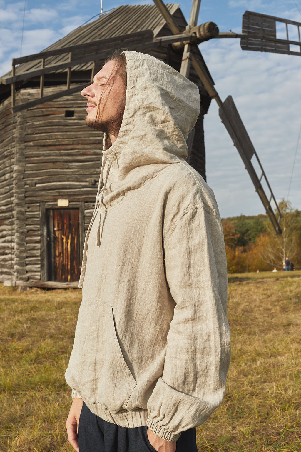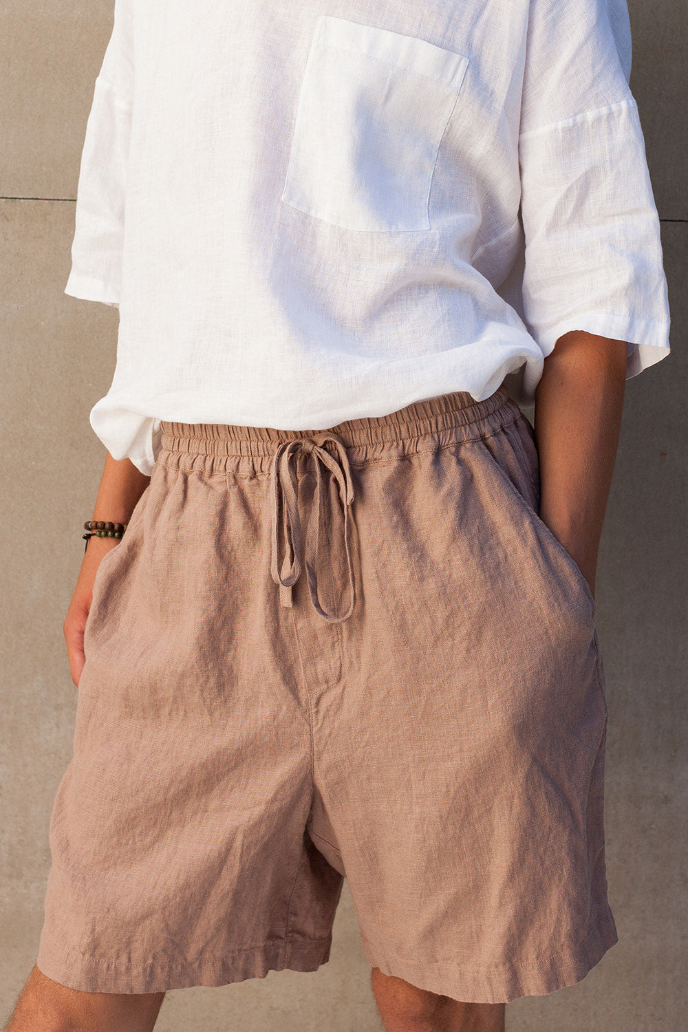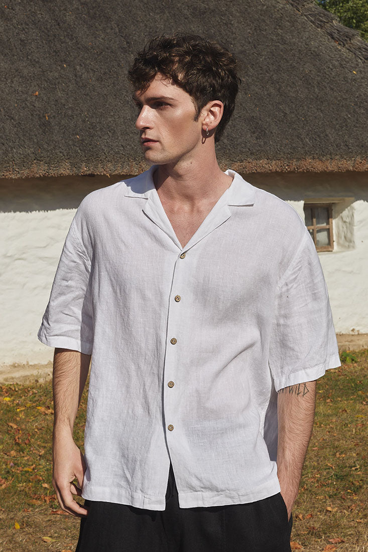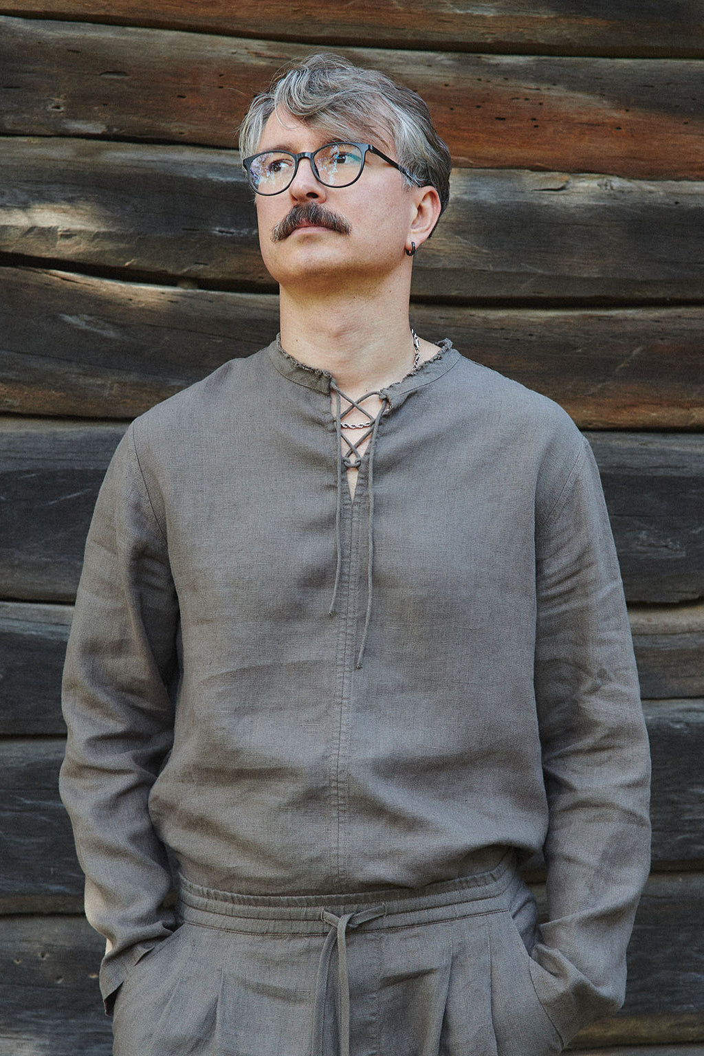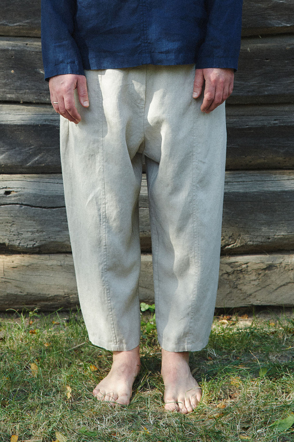 Model is 6’4” (192 cm) and modelling size L in Smoke Blue medium weight linen 170 GSM.