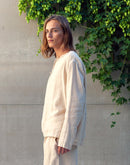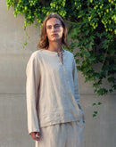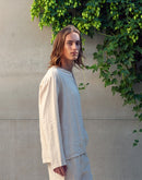 Model is 6’4” (192 cm) and modelling size L in Bleached Sand medium weight linen 180 GSM. Available in any other color from our palette.