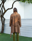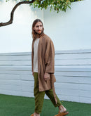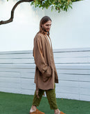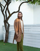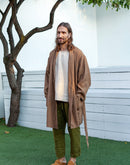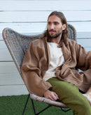 Model is 6’1” (186 cm) and modelling size L in Tobacco Brown heavy weight linen 250 GSM. Available in any other color from our palette.